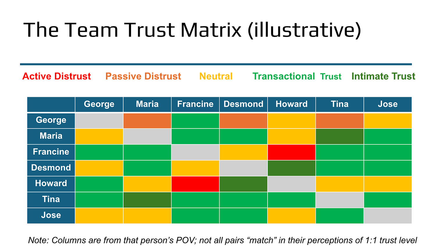 As a leader, you need to understand at a deep level the landscape of trust across your teams. I help leaders do this in a disciplined way using what I call the Team Trust Matrix to examine 1:1 relationships as well as the overall pattern across the team.